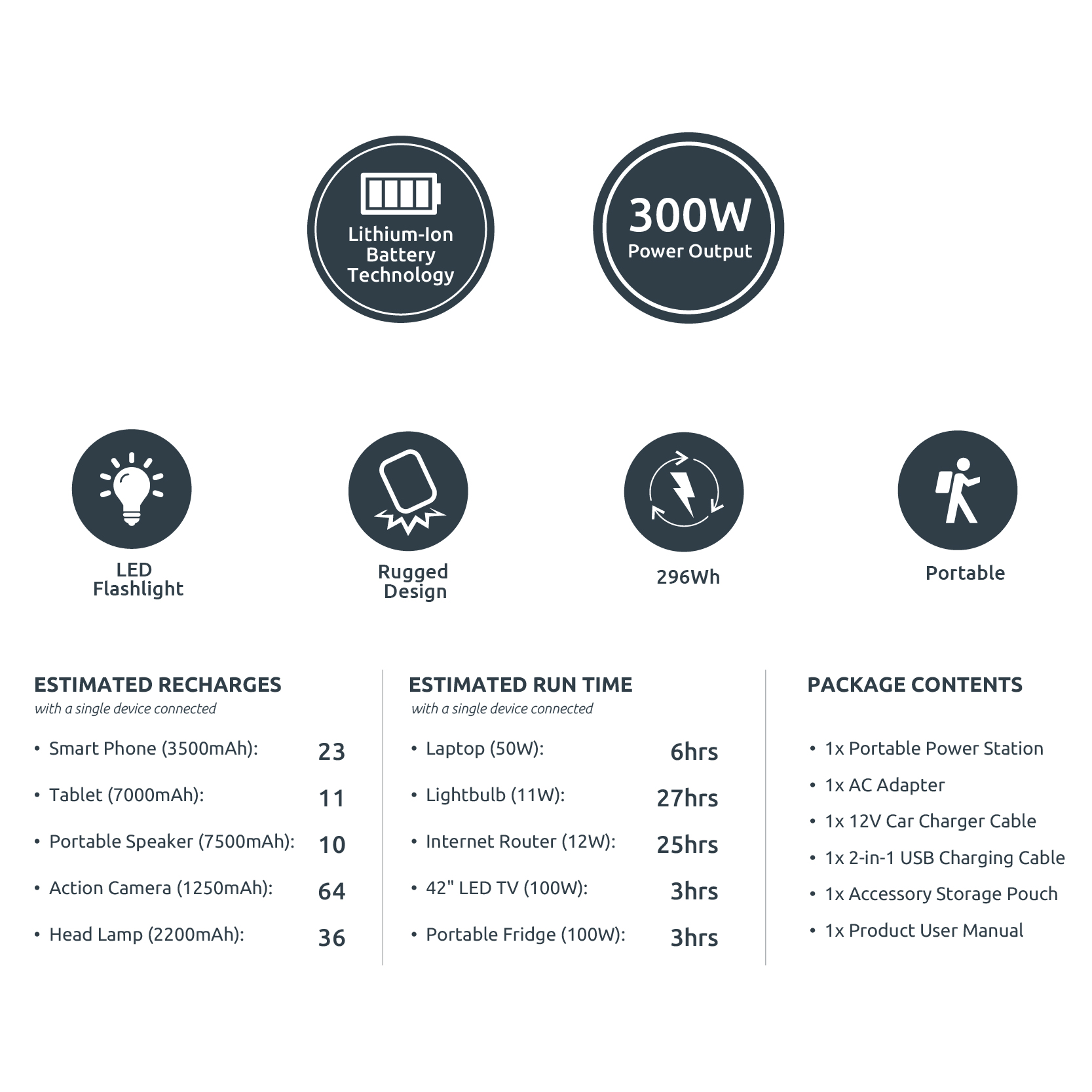 - DC Car Charger: 12V (9.5hrs)